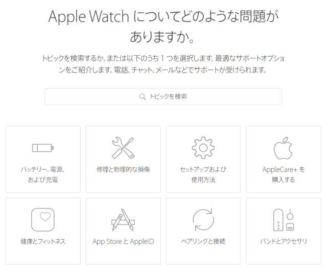 iPhoneやアップルウォッチ、iPodなどのアップル製品のサポートをここからお願いすることが出来ます。とりあえずは「Applewatch」を選択し、なにを聞きたいかを選びます。