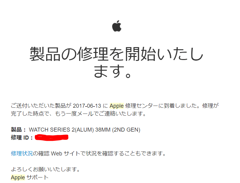 Appleに到着した旨メールで連絡がきました。こうやってきちんと報告しながら修理が進んでいきます。